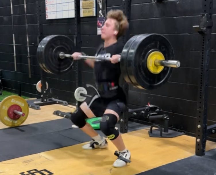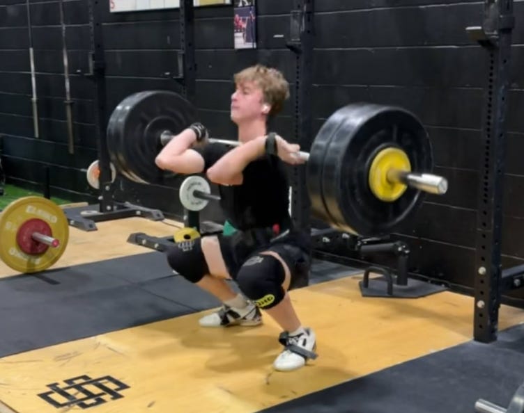 Ideally, your athlete should be receiving their clean or snatch around this position, just at about parallel. Sometimes the bar crashes and forces them into a deep squat. If that’s the case, we hope you’ve been training deep squats. From this position, the athlete receives the bar into a squat and comes back up like a normal front squat with their feet at shoulder width, and keeping the elbows high and chest out with shoulders pinched back. At this point, you just want your athlete to “keep their chest up” and push out of the bottom.
